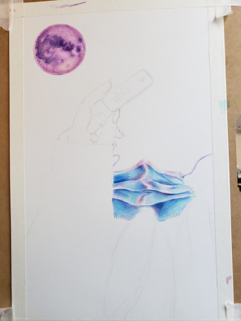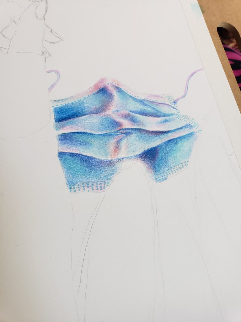 I really wanted to draw a mask since the beginning of the pandemic and I kind of want every artist to do this! In the future, everyone will look at art between 2020 – 2023 and see all the artwork that has vaccines, shots, syringes, masks, and viruses in them. I just think it will be really nice. Something for the grandchildren I guess.