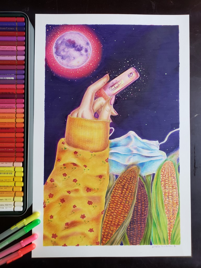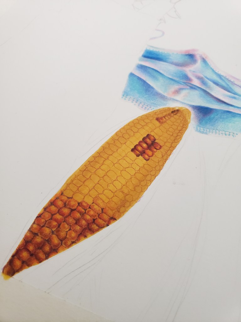 More corn. I like drawing on my bed, especially since the days I worked on this were particularly cool. So my bed was more cozy to be on than my desk.