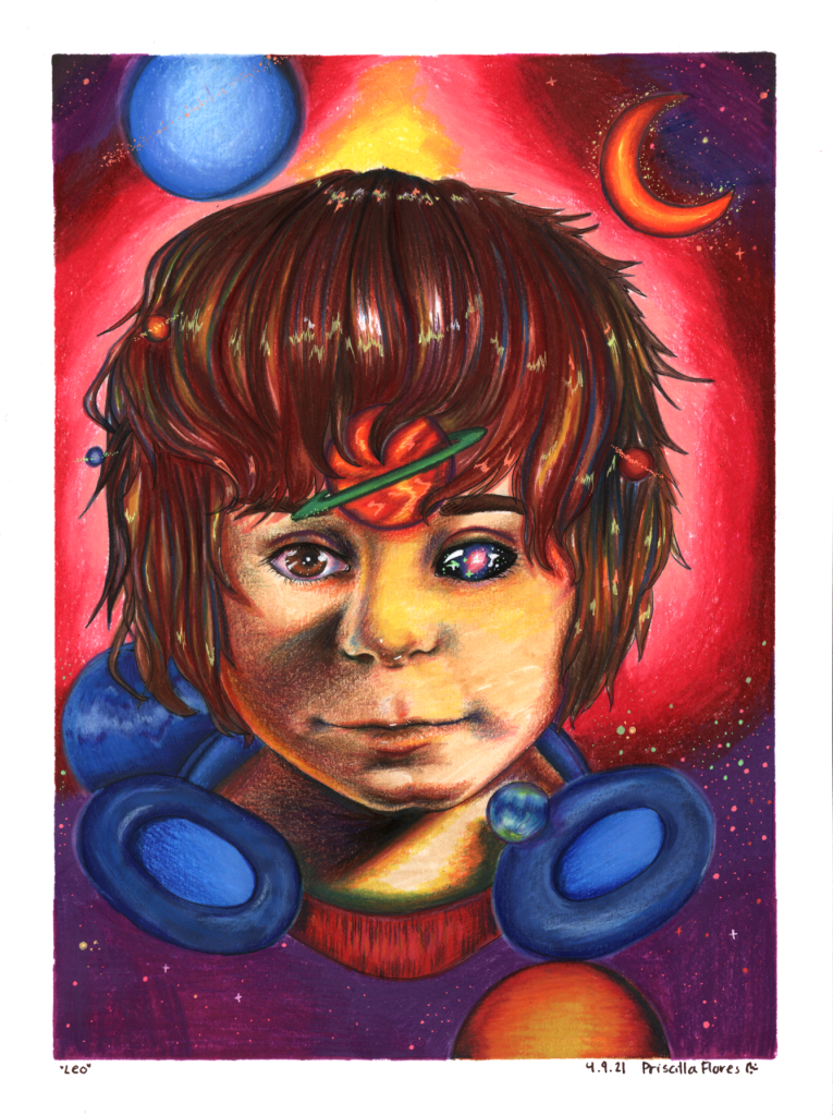 Through exploring the entire spectrum of art mediums, the love and obsession with color and ink have become part of my daily experience. Specifically, alcohol markers with an overlay of colored pencils are the tools I’ve grown to enjoy and work with in every art piece. What I try to capture the most in my work is the existence of a world that is beyond our own, a world that is seen or experienced at night, or I hope to embody the Saturn Myth, an idea that planets were closer—much, much closer. I log my dreams in a leather book and use these visions to create my work, and hope to encourage my own mind to never stop what happens during the night.